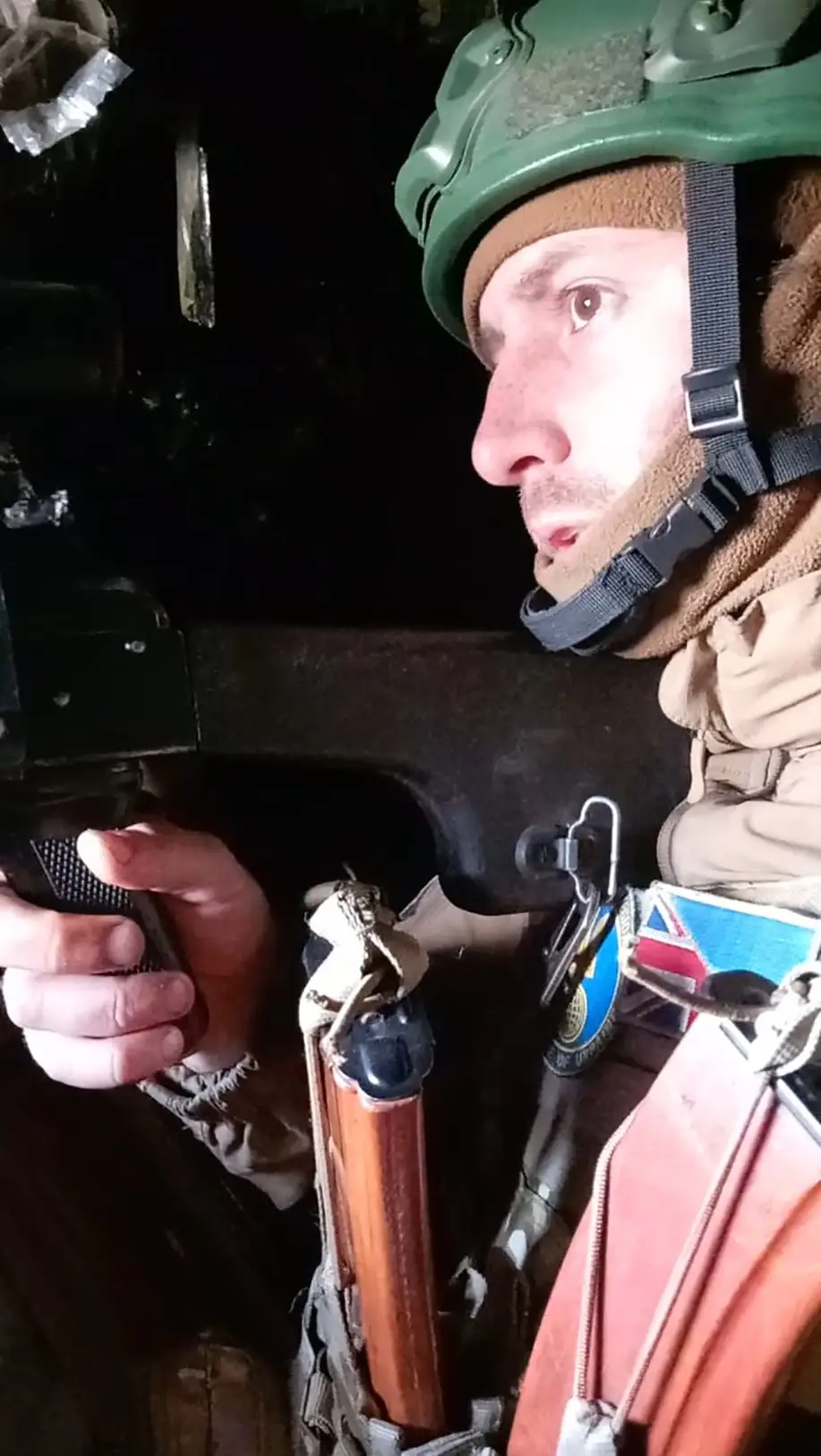 Mon commandant de section s'est approché de moi et a fait une expérience avec mes doigts. Cette expérience simple m'a laissé perplexe. J'ai dit : « Eh bien, je sais que vous avez des doigts, mais je ne sais pas combien vous en avez levés. » Il m'a donc retiré de la rotation. J'ai dit : « D'accord, laissez-moi partir. Je vais signer les papiers, retourner en Angleterre et me faire soigner. » Mais le commandant du bataillon de l'époque n'était pas d'accord : « Non, vous êtes mon soldat. Vous méritez un traitement gratuit ici ou à l'étranger. Je vais envoyer un médecin avec vous à l'hôpital militaire de Kharkiv. »